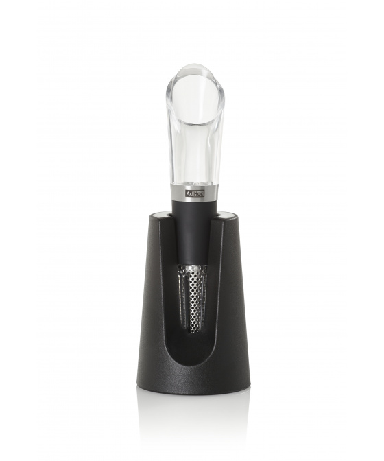 Nálevka využívá Venturiho principu - víno provzdušní při nalévání. Silikonové hrdlo padne do každé láhve, nerezový filtr zachytí případné usazeniny. Nálevku vám dodáme včetně stojánku a odkapávacího nástavce.