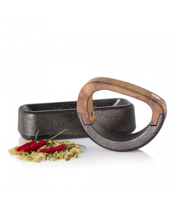 Litinová nádoba na drcení koření se hodí na jakékoliv koření. Tvarově je vyrobeno tak že neuteče ani zrnko. Tlouk i nádoba z masivní litiny, rukojeť z akácie. Nádobka je opatřena protiskluzovými nožičkami.