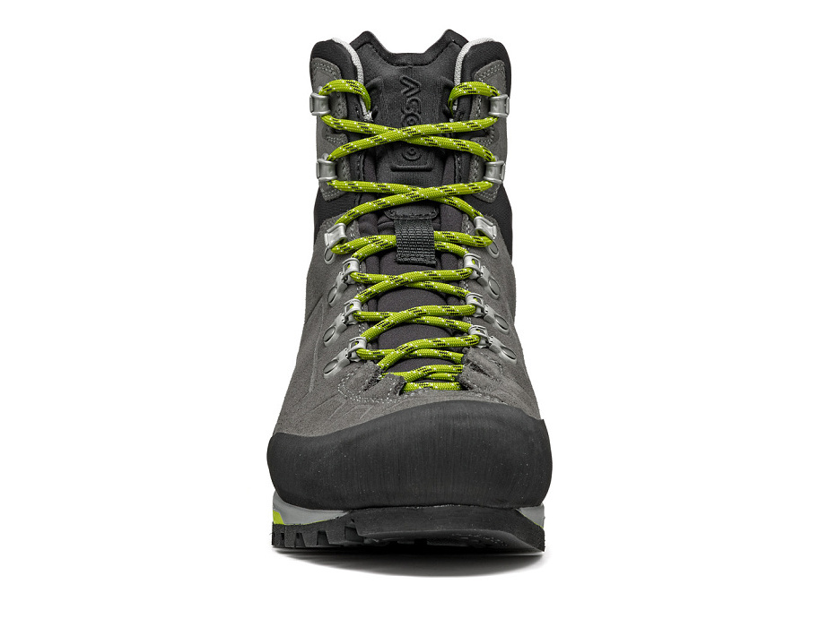 Sníh, led a skála. Nevyzpytatelný terén, ve kterém při každém kroku zvedáš navíc ještě tíhu batohu. Tam nahoře musí být každý krok přesný a promyšlený. A tak ti tyto pevné pohorky od Asola pomohou najít tu správnou oporu. Jejich kostra je vyztužená nylonem a skelnými vlákny, takže mačky na pohorkách dobře sedí a pevně se zakousnou do ledu, který ti zkříží cestu. Přestože je podešev pro větší jistotu v nestabilním terénu jen málo ohebná, lezecká špička ti pomůže ustát i menší skalní stupy. A protože v horách se potkáš s ledasčím, mají pohorky svršek z odolné Perwanger kůže, kterou po obvodu chrání gumová obsázka.