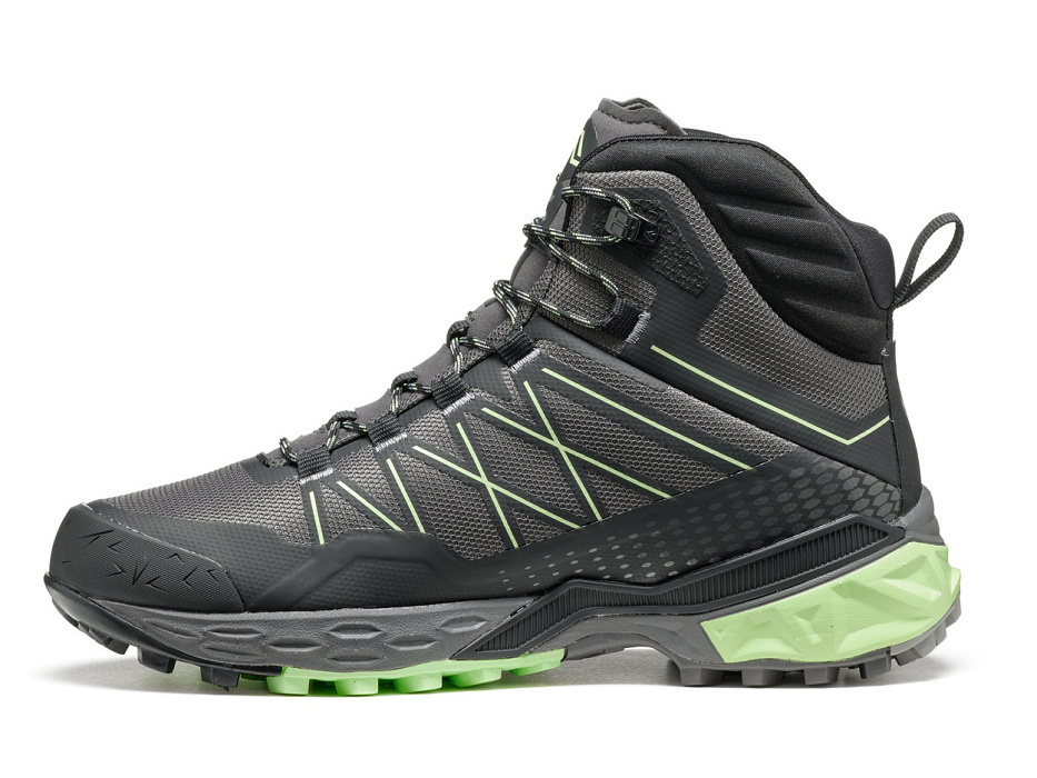 Stezka ubíhá pod nohama stejně jako mraky po obloze. Kameny ničemu nepřekáží, zbytky sněhu po zimě nevadí, dokonce ani kolena z kopce nedutají. Tyto lehké polokotníkové boty Asolo můžeš prohnat horami ve svižném tempu. Patří do kategorie fastpacking a proto mají v podešvi novou směs Asolo Sigma Grip, která se zakousne do terénu, i když bude mokrý. A v blátě se také vytáhne – díky samočistícímu účinku. Kdyby tě tam nahoře zastihla bouřka a stezka se proměnila v potok, nepromokavá membrána Gore-Tex® udrží tvé nohy v suchu. A tlumící mezipodešev z materiálu EVA ušetří nohy všech tvrdých nárazů.