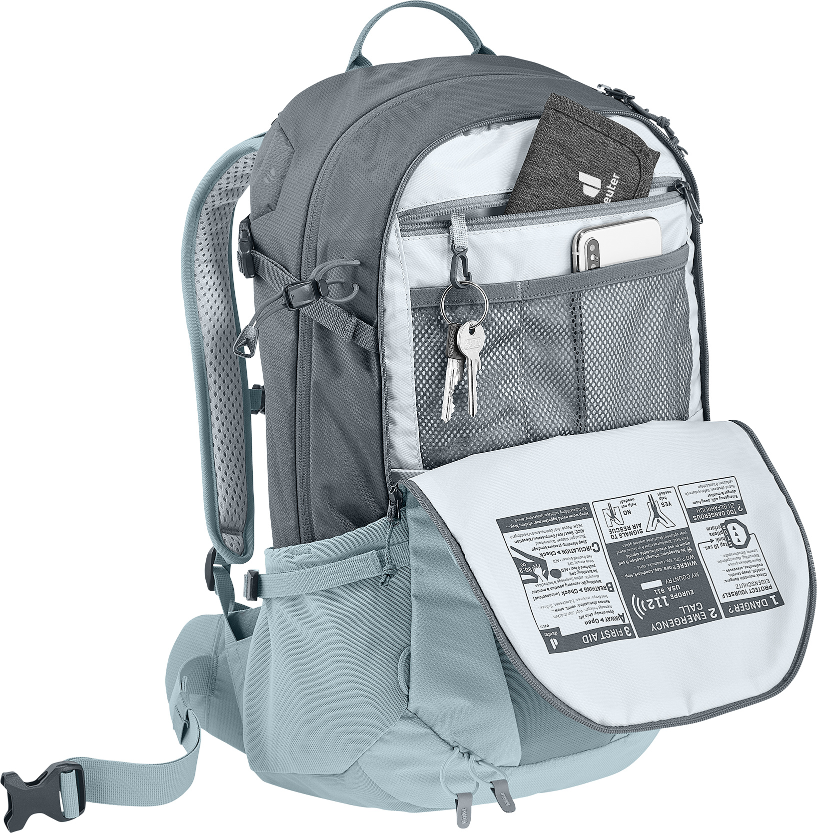 Díky propracovanému zádovému systému Aircomfort s napnutou síťkou budete mít záda v suchu i při náročném výstupu. Kovová výztuha pomáhá rovnoměrně rozložit hmotnost nákladu. Elastická čelní kapsa pojme bundu, boční kapsy láhev a kapsa na hydrovak až 3 litry tekutin. Nechybí pláštěnka, hrudní i bederní pás, poutka na hole a kapsy na drobnosti.