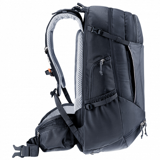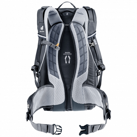 Batoh Deuter Trans Alpine 30 je postavený na ověřeném, hliníkovými tyčemi vyztuženém zádovém systému Airstripes, který přináší pevné a bezpečné uchycení na zádech, což oceníte na výletech i na náročných sjezdech. Dvoucestný hrudní popruh a bederní pás s kapsičkou na zip ho ještě dokonaleji přitáhnou. Dva pruhy tvarované pěny s prodyšnou síťovinou se minimálně dotýkají zad a umožňují tak maximální odvětrávání díky komínovému efektu.
