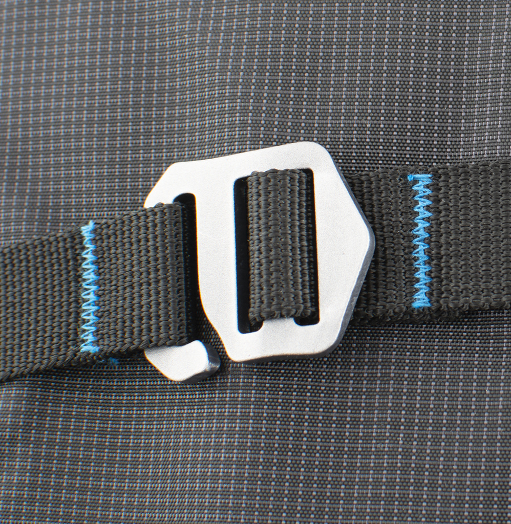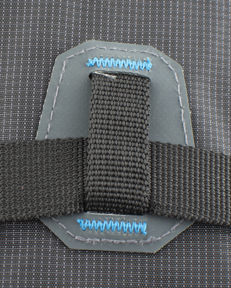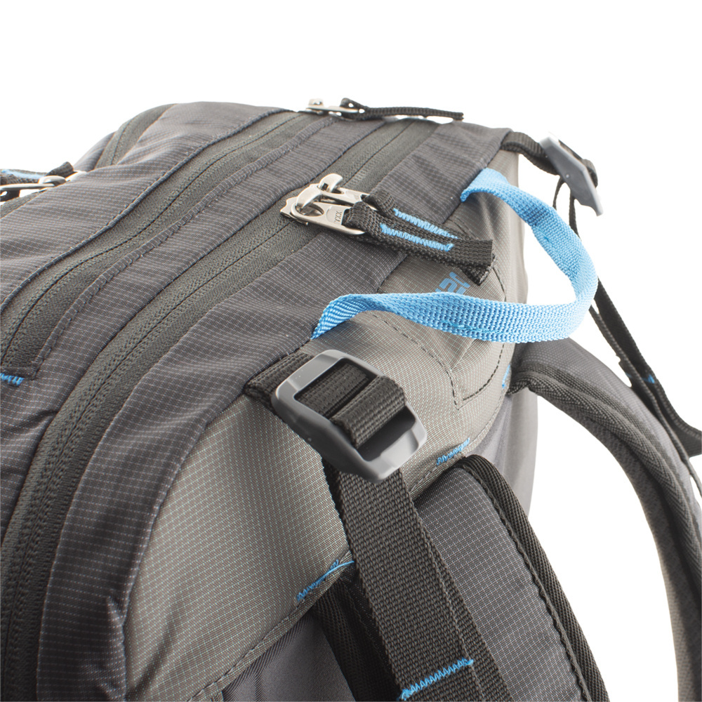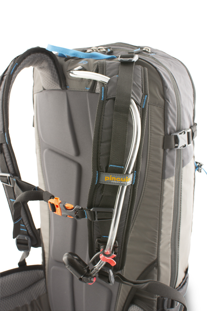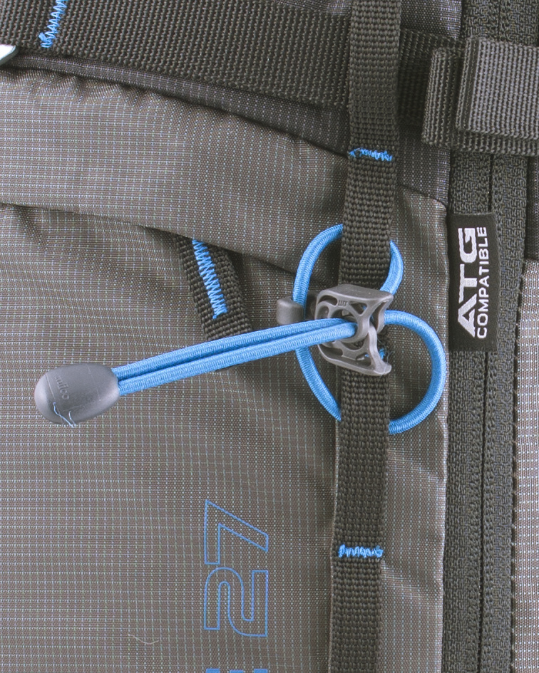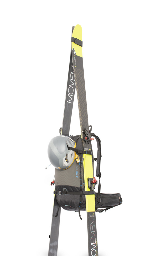 - Odolné kovové háčky a Hypalonem podložená poutka na čele batohu k diagonální fixaci lyží.