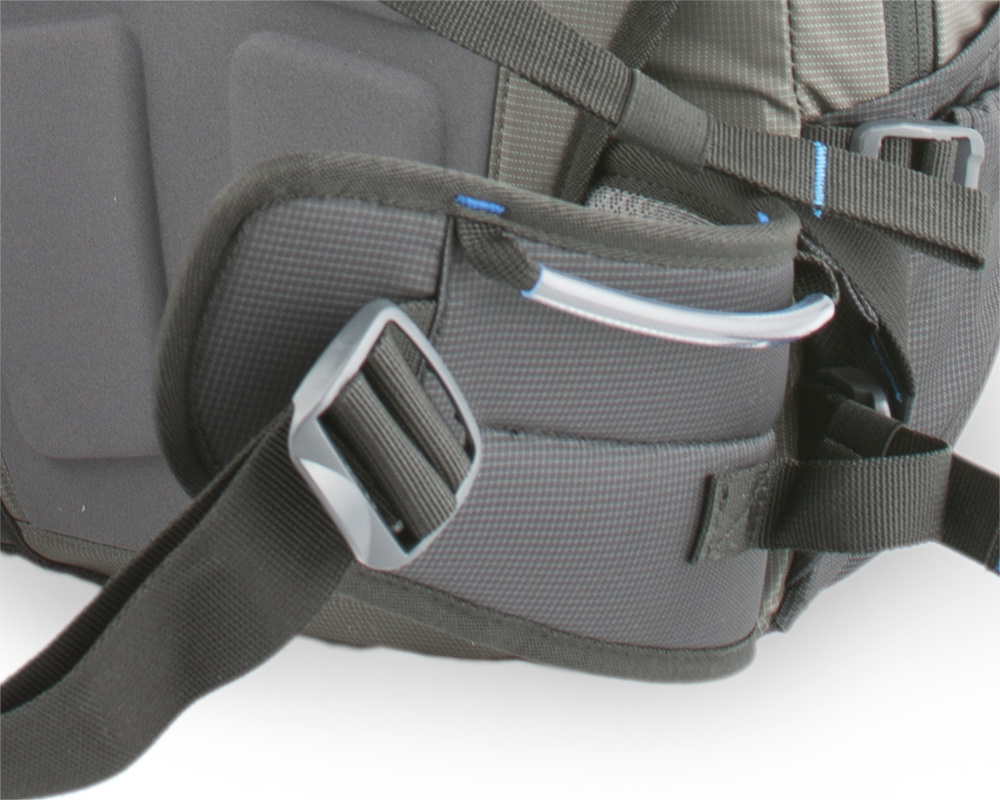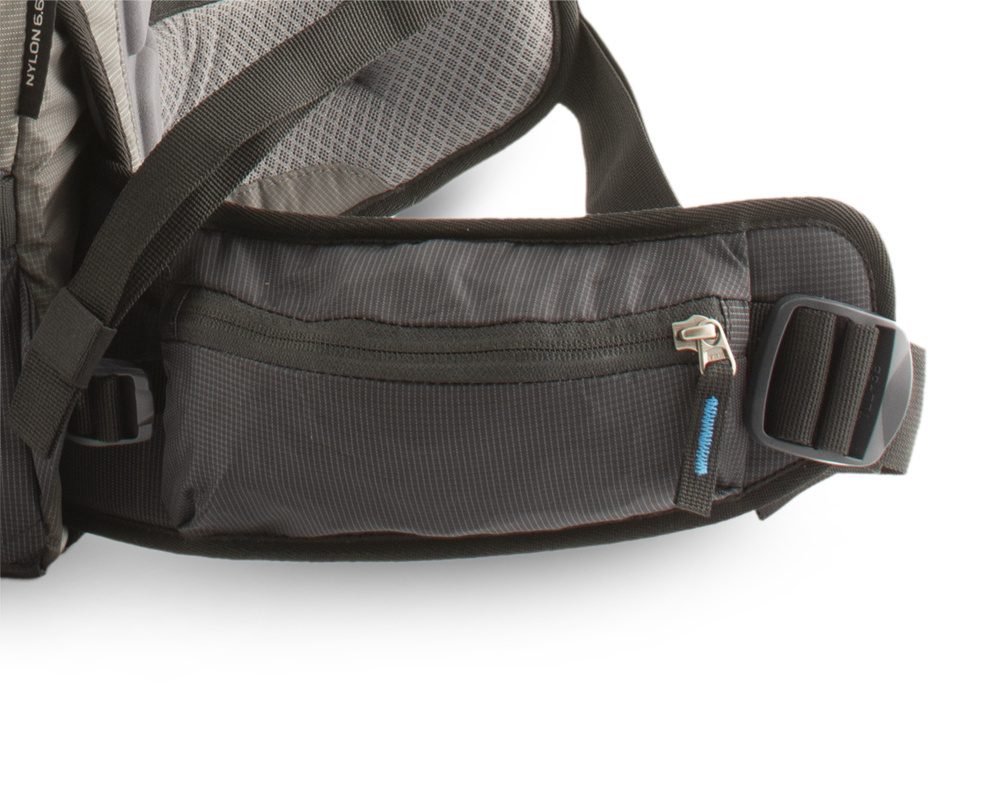 - Zipová kapsa na pravé straně bederního pásu, poutko na karabiny nebo lyžařské mačky na jeho levé straně.