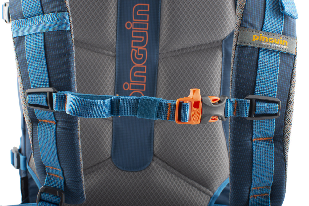 - Výškově nastavitelný a odepínatelný hrudní popruh s píšťalkou pro případ nouze.