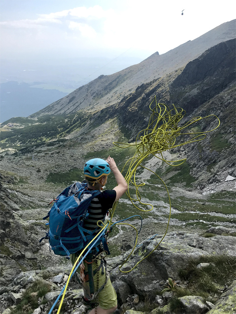 - Pružná poutka s háčky na připevnění teleskopických holí nebo cepínů.
