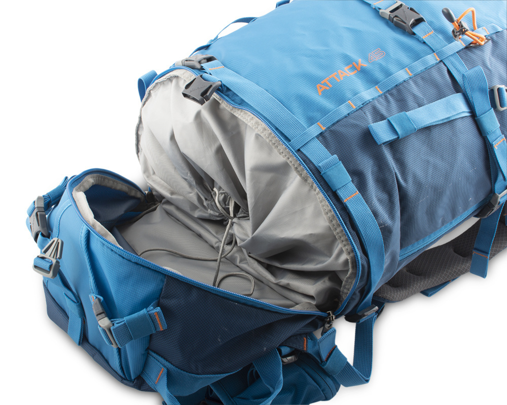 - Vyztužená chlopeň a fixační popruhy na dolní komoře pro bezpečné upevnění cepínů.