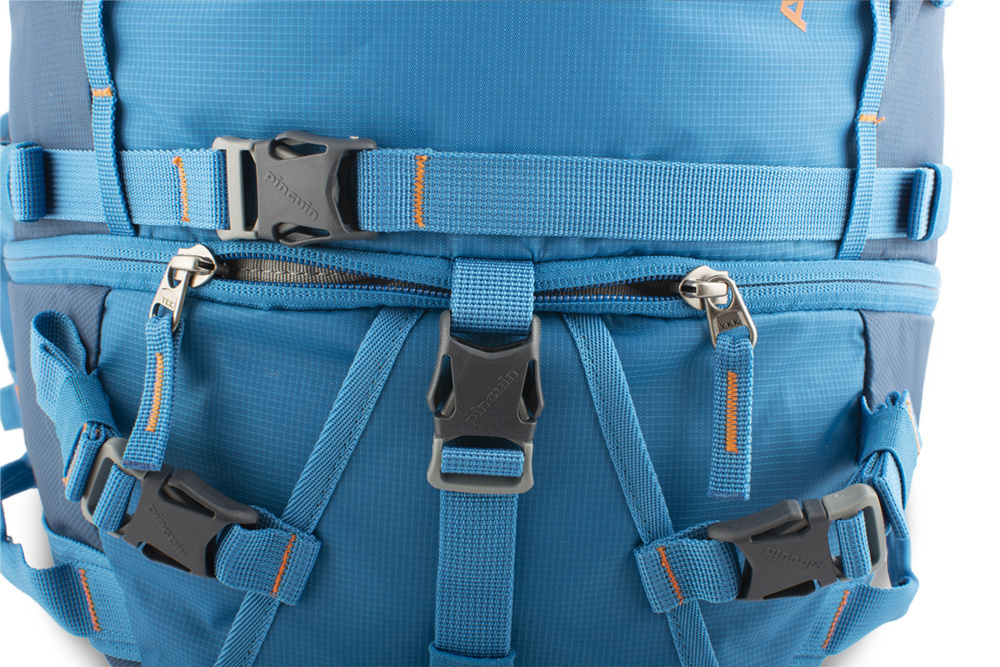 - Pár horizontálních popruhů pro snadné přichycení snowboardu nebo sněžnic z čela batohu nebo lyží a splitboardu na jeho bocích.