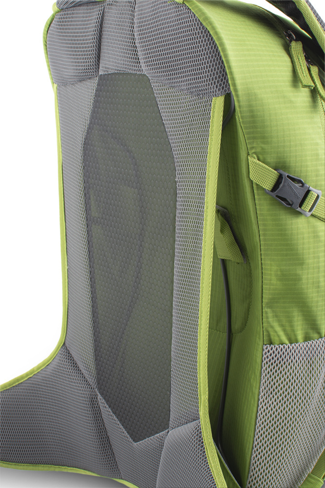 - Velmi pohodlný, odvětraný zádový systém AVBS kombinující pevnou síťovinu s 3D mesh panely, umožňující maximální odvětrání zad při zachování optimálního rozložení nákladu. Předpětí zádového systému drátěným rámem.