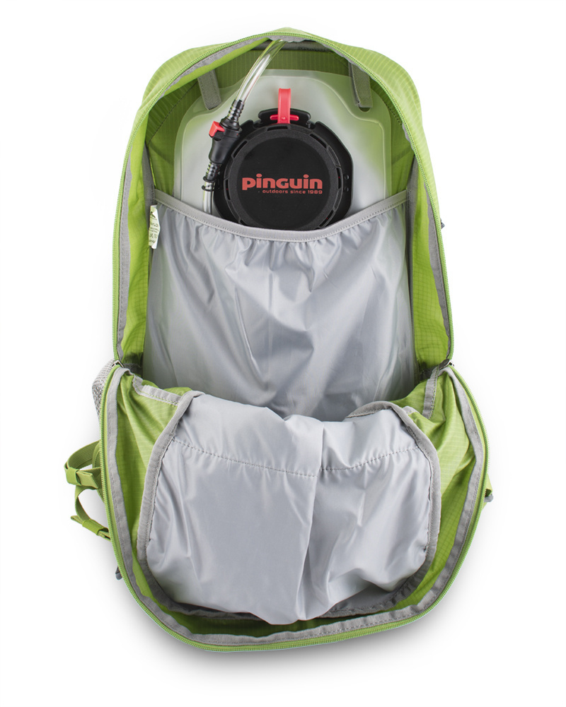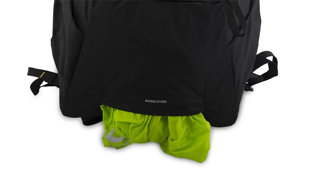 - Výrazná pláštěnka v samostatné zipové kapse na dně batohu. Umístění kapsy umožňuje využít kapsu pro transport pouzdra na nářadí.
