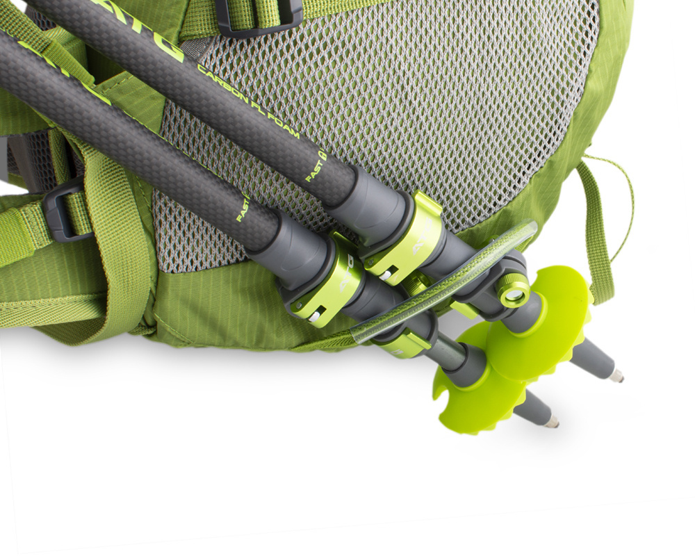 - Poutko na upevnění trekových holí za chůze na levém ramenním popruhu a pod levou síťovanou kapsou.Pružná poutka s háčky na připevnění trekových holí na čele a poutka na dně batohu.