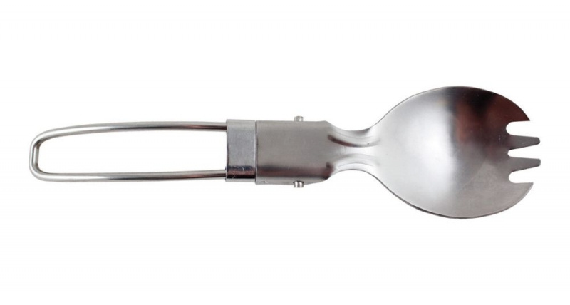 skládací nerezový spork vyrobený z nerezové oceli skládající se ze lžíce a vidličky o délce 10 cm ve složeném stavu