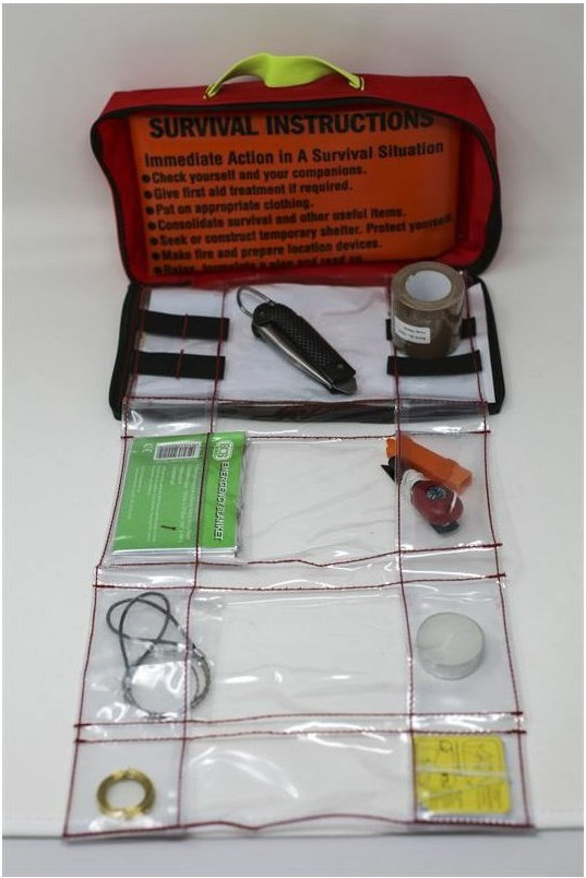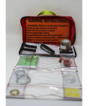 sada pro přežití s prostředky pro procvičování občanské připravenosti a soběstačnosti, dovedností pro přežití a řešení nouzových situací v případě nenadálé krize položky jsou baleny v kompaktním odolném a viditelném nylonovém pouzdru s vodotěsným zipem, který výbavu chrání a zároveň umožňuje snadný a rychlý přístup pouzdro obsahuje několik přihrádek pro přehledné uspořádání a organizaci uložených položek dvě poutka na zadní straně pro upevnění k popruhu batohu, opasku nebo jiným součástem vybavení vnější transparentní kapsa pro uložení instrukcí pro přežití nebo jiných náležitostí, které chcete mít hned po ruce držadlo pro přenášení z důvodu neustálého vývoje a zdokonalování se může obsah tohoto pouzdra lišit není určeno osobám mladším 18 let obsah sady: oranžový nouzový vak signální zrcátko 5 cm nouzová termofólie kapesní nůž žiletka s jedním ostřím stahovací pásky bílý nylonový provázek 90 cm svíčka tužka šicí souprava zlatý drát 3,5 m sada pro rybaření strunová pila nouzová píšťalka magnéziový podpalovač s ocílkou a kompasem zavírací špendlíky instrukce pro přežití v anglickém jazyce transparentní silikonová hadička 1 m LED mikro svítilna pouzdro knoflíkový kompas lepící páska