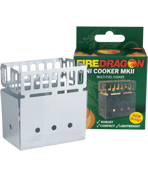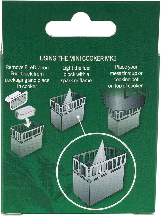 -ultralehký, kompaktní a odolný mini vařič na pevná paliva pro použití ve venkovním prostředí -účinný a opakovatelně použitelný -boční strany slouží závětří na ochranu před větrem, které zvyšuje účinnost a snižuje teplotní ztráty během vaření -při použití objemnějších nádob je možné boční strany rozložit a vytvořit větší varnou plochu -vařič je navržen tak, aby dosáhl nejlepších výsledků v kombinaci s palivy Fire Dragon ,ale lze využít i jiná vhodná pevná paliva -palivo není součástí balení -vyrobeno z ocelového plechu -navrženo pro kempování, turistiku, na festivaly a další aktivity