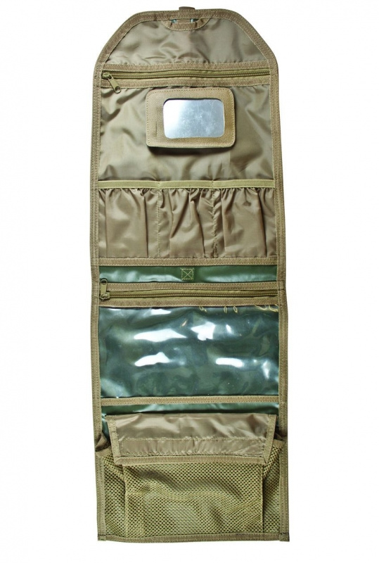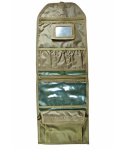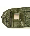 toaletní vak v maskovaném provedení s vyjímatelným zrcátkem uzavíratelný přezkou, se třemi kapsami na zip, přihrádkami na toaletní potřeby a háčkem pro zavěšeníVíce