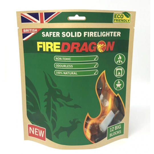 -Fire Dragon je inovativní a pro životní prostředí nezávadné pevné palivo -stačí jen vyjmout kostku paliva, vložit pod troud, uhlí či dřevo a zapálit ji -netoxický, voděodolný a bez zápachu -lehce a rychle vznětlivý, pro podpálení lze použít škrtadlo, sirky nebo zapalovač -hoří jasným čistým plamenem -produkuje minimum sazí, takže neušpiní nádobí -výhřevnost 27-30 kJ/g -výrobek je zdravotně nezávadný, lze jej balit společně s potravinami -každý blok pevného paliva hoří až 8 minut, dva bloky společně až 12 minut -doba potřebná k uvedení vody do bodu varu: 5 minut na 500 ml vody v systému Bushcraft Crusader II Cooking System -patentovaný výrobek: GB2500062 -vyrobeno ve Velké Británii, testováno vojenskými složkami NATO -obsahuje denaturovaný líh