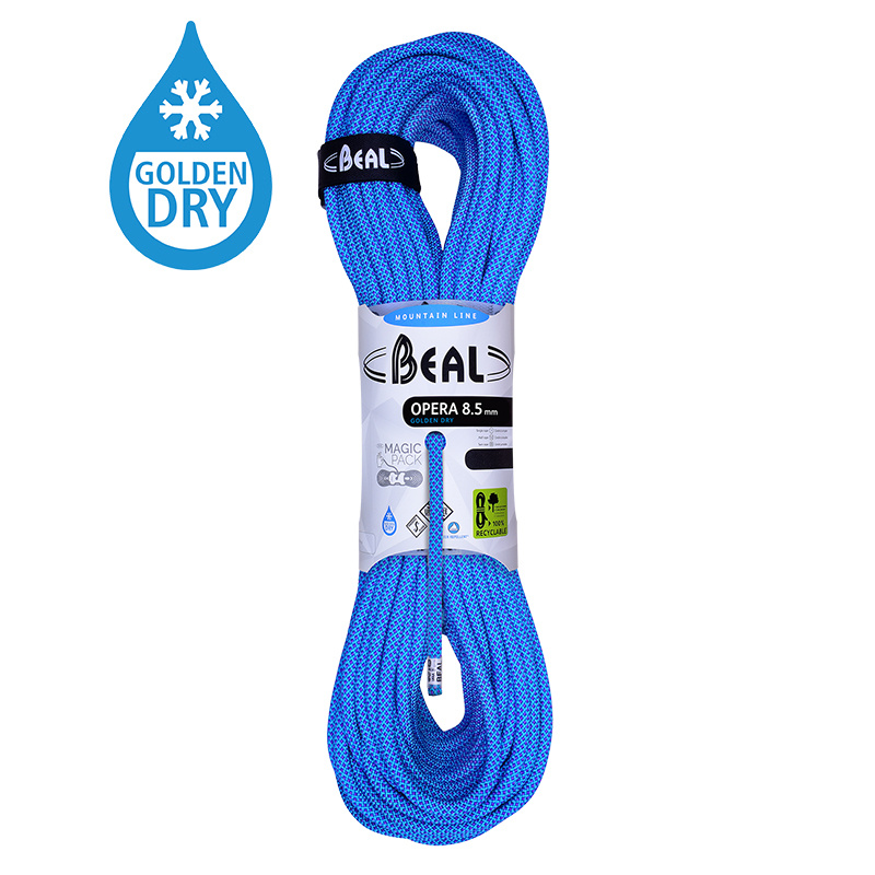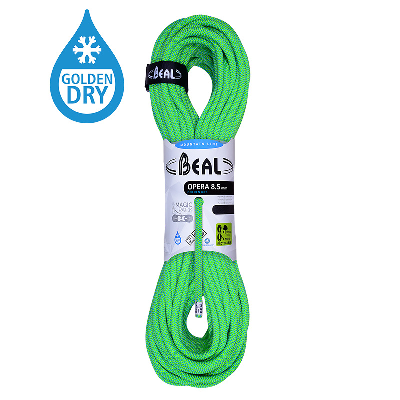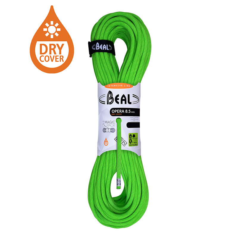 Opera Unicore® 8,5 mm je ultralehké dynamické lano o průměru pouhých 8,5 mm s certifikací jako jednoduché, poloviční i dvojité lano. Lano Beal Opera, ve variantě s impregnací opletu Dry Cover, je vhodné pro všechny venkovní lezecké disciplíny, avšak díky svému průměru je vhodné pouze pro velmi zkušené lezce. S hmotností 48g / m je vůbec nejlehčím a nejtenčím lanem na trhu s certifikací jako jednoduché lano. Všechny varianty Opery jsou vybaveny technologií UNICORE®, která pevně spojuje jádro s opletem a tím výrazně zvyšuje bezpečnost i životnost lana. BEAL Opera se kromě klasického provedení lana s černým markerem pro označení středu nabízí také s úpravou opletu Safe Control, kde je každá půlka lana pletena jiným vzorem opletu. Pro zimní aktivity doporučujeme plnou impregnaci lana Beal Opera Unicore 8,5 mm Golden Dry.
