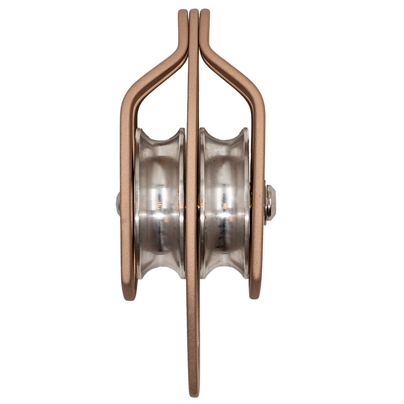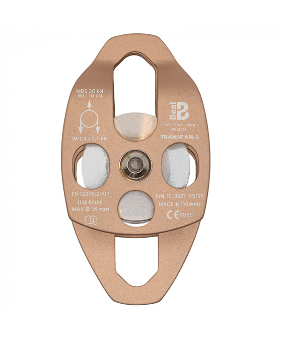 Transf Air 2 je velká dvojitá kladka s otočnou bočnicí, ideální pro stavbu efektivních kladkostrojů. Robustní konstrukce s nerezovým čepem a podložkou zajišťuje dlouhodobou odolnost i v náročných podmínkách. Kladka je osazena na bronzovém pouzdře, které zlepšuje účinnost a plynulost chodu i při vyšším zatížení. Maximální průměr lana je ? 16 mm, takže nabízí širokou kompatibilitu pro pracovní i záchranné systémy.