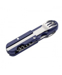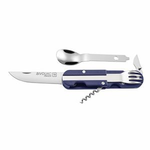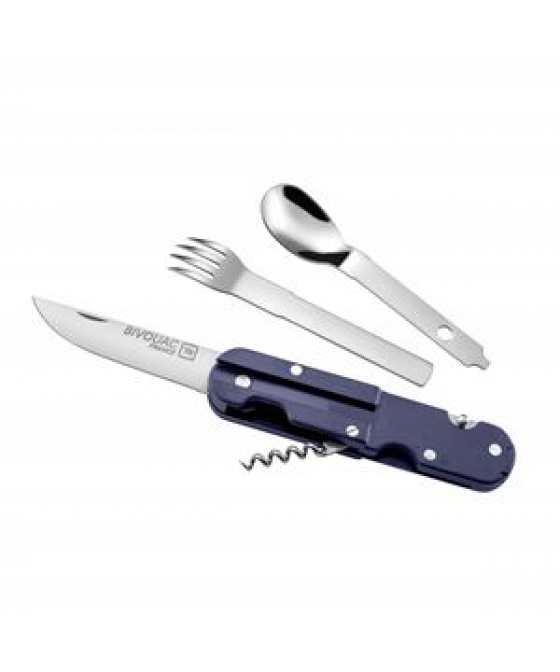 Popis BIVOUAC CAMP KNIFE BLUE HANDLE - TEXTILE POUCH - FORK and SPOON