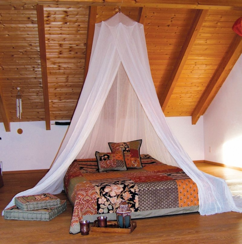 dekorativní moskytiéra z neupravované přírodní bavlny ve tvaru zvonu přes dvě postele s hustotou 95 ok na cm2 a bambusovými rozpěrkami určená pro interiérVíce
