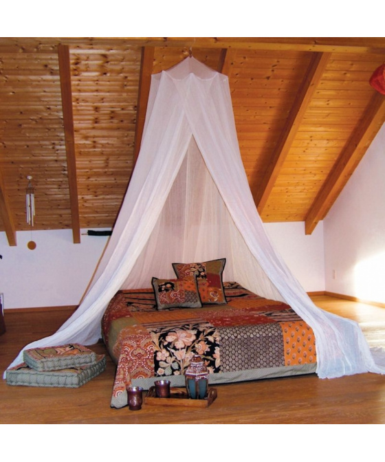 -vysoce dekorativní bavlněná moskytiéra ve tvaru zvonu přes dvě postele -určeno pro fyzickou ochranu před komáry a dalším nepříjemným hmyzem a zároveň jako dekorace interiéru -hustota více než 100 ok na cm2 -kroužek pro zavěšení na horním okraji (závěsný systém není součástí balení) -skládací bambusové rozpěrky se zasunují do střechy, aby se moskytiéra dobře rozprostřela -během používání nevznikají elektrostatické výboje na povrchu materiálu -uloženo v bavlněném vaku se stahováním -moskytiéry z kolekce Cotton jsou skutečnou alternativou k syntentickým moskytiérám a jsou vyráběny z neupravované 100% přírodní bavlny -bavlna není upravována úmyslně - není odbarvená, předsražená ani mercerovaná pro zachování přírodních vlastností -velmi dobrá absorpce vlhkosti materiálu pro zajištění příjemného klima během spánku pod moskytiérou -síť může absorbovat vlhkost také během transportu nebo skladování, přičemž se může vyvinout specifická vůně materiálu -tato vůně zmizí sama od sebe, pokud je bavlněnému materiálu umožněno dýchat a přirozeně se vysoušet na vzdušném, suchém místě