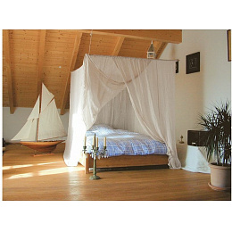 prostorná dekorativní bavlněná moskytiéra ve tvaru boxu přes dvě postele, která poskytuje ochranu před hmyzem dokáže úspěšně odpuzovat bodavý hmyz, jako je např. druh Culex, Anopheles (malárie) nebo Aedes (horečka dengue, žlutá zimnice, chicungunya) určeno pro fyzickou ochranu před komáry a dalším nepříjemným hmyzem a zároveň jako dekorace interiéru hustota více než 100 ok na cm2 obvod moskytiéry 8 metrů dvě závěsné bambusové tyče o délce 1.6 m s bavlněnými šňůrami pro zavěšení ze stropu s rozměry střechy 1.6 x 2 metru překrývající se vchod během používání nevznikají elektrostatické výboje na povrchu materiálu uloženo v bavlněném vaku se stahováním moskytiéry z kolekce Cotton jsou skutečnou alternativou k syntentickým moskytiérám a jsou vyráběny z neupravované 100% přírodní bavlny bavlna není upravována úmyslně není odbarvená, předsražená ani mercerovaná pro zachování přírodních vlastností velmi dobrá absorpce vlhkosti materiálu pro zajištění příjemného klima během spánku pod moskytiérou síť může absorbovat vlhkost také během transportu nebo skladování, přičemž se může vyvinout specifická vůně materiálu tato vůně zmizí sama od sebe, pokud je bavlněnému materiálu umožněno dýchat a přirozeně se vysoušet na vzdušném, suchém místě