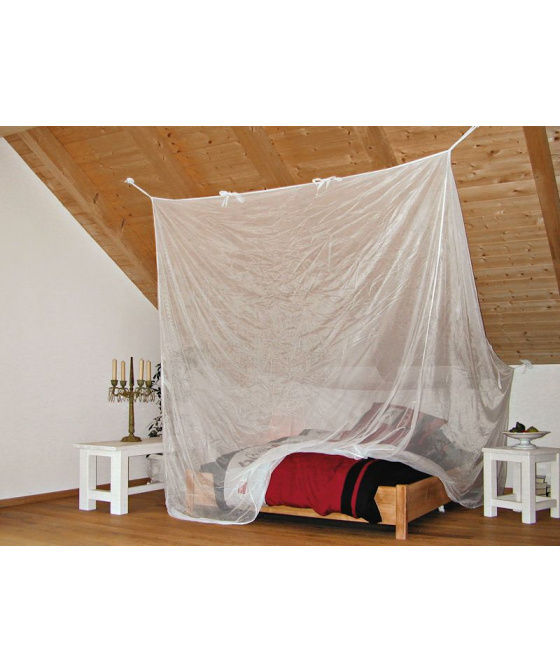 -vysoce kvalitní prostorná moskytiéra se sklonem 45° v zadní části, která se hodí zejména do ložnic se sklopenými stropy -moskytiéra je vyrobená z odolné bílé polyesterové síťoviny 43g/qm, která poskytuje ochranu před hmyzem -dokáže úspěšně odpuzovat bodavý hmyz, jako je např. druh Culex, Anopheles (malárie), Aedes (horečka dengue, žlutá zimnice, chicungunya), stejně jako běžné komáry a moskyty -určeno pro 2 osoby k přehození přes postel -vázací šňůry v rozích a šest poutek podél horního obvodu moskytiéry pro možnost zavěšení -ideální pro nerušený spánek doma, na dovolené nebo na cestách, nejlépe se hodí do hotelů a apartmánů -úložný bavlněný obal se stahovací šňůrkou -moskytiéra není impregnovaná