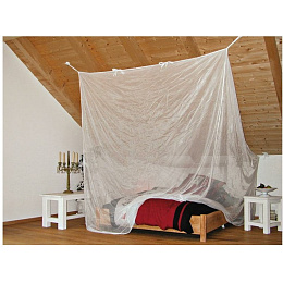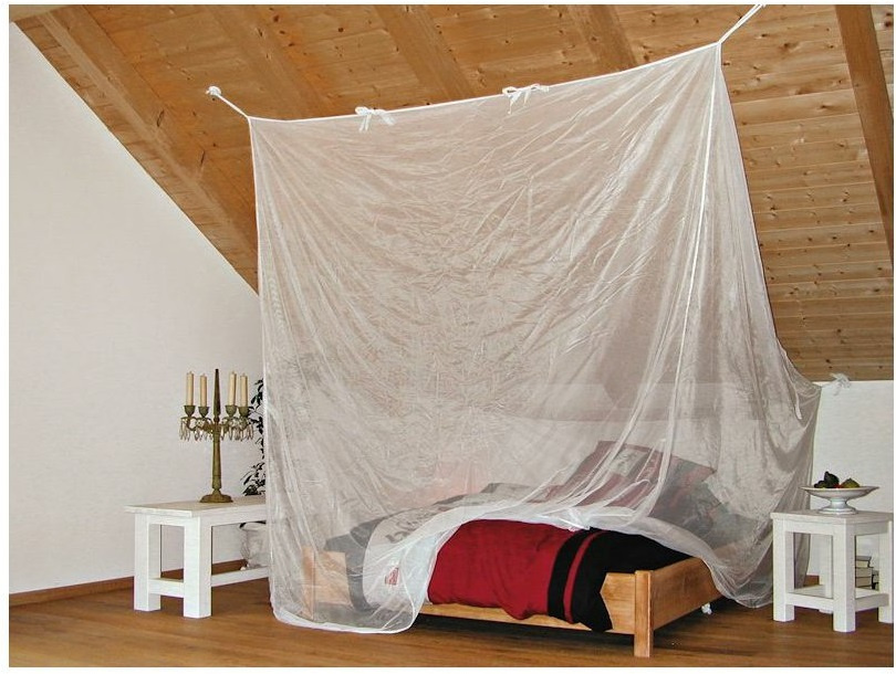 vysoce kvalitní prostorná moskytiéra se sklonem 45° v zadní části, která se hodí zejména do ložnic se sklopenými stropy moskytiéra je vyrobená z odolné bílé polyesterové síťoviny 43g/qm, která poskytuje ochranu před hmyzem dokáže úspěšně odpuzovat bodavý hmyz, jako je např. druh Culex, Anopheles (malárie), Aedes (horečka dengue, žlutá zimnice, chicungunya), stejně jako běžné komáry a moskyty určeno pro 2 osoby k přehození přes postel vázací šňůry v rozích a šest poutek podél horního obvodu moskytiéry pro možnost zavěšení ideální pro nerušený spánek doma, na dovolené nebo na cestách, nejlépe se hodí do hotelů a apartmánů úložný bavlněný obal se stahovací šňůrkou moskytiéra není impregnovaná