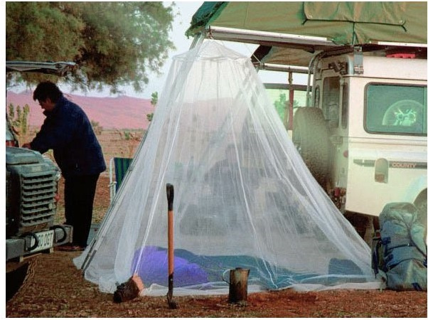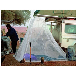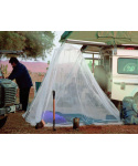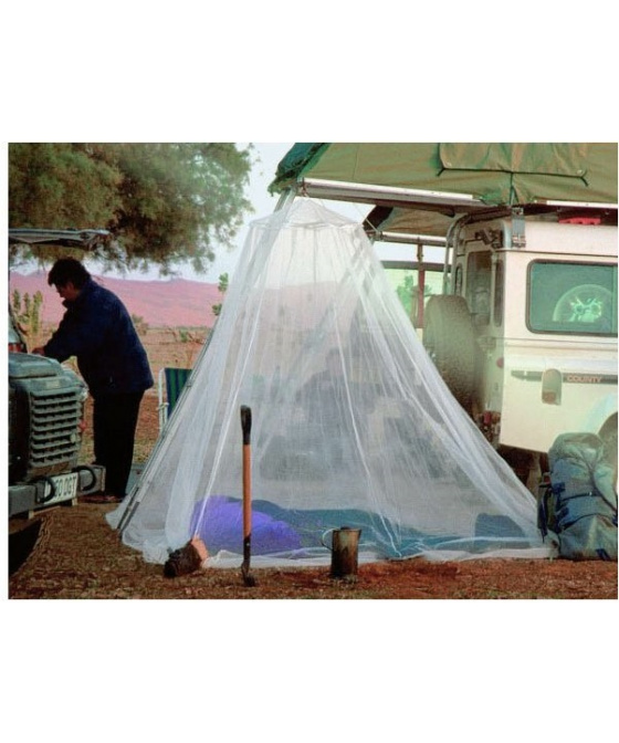 lehká velmi prostorná moskytiéra ve tvaru zvonu vyrobená z obzvláště jemné síťoviny, která poskytuje ochranu před drobným hmyzem díky velikosti ok a svému tvaru dokáže úspěšně odpuzovat bodavý hmyz, jako je např. druh Culex, Anopheles (malárie), Aedes (horečka dengue, žlutá zimnice, chicungunya), stejně jako písečné komáry čeledi Phlebotomidae (leishmanióza) a běžné komáry a moskyty (filarióza) poskytuje celkovou ochranu také proti písečným blechám lehký bambusový vršek o průměru 60 cm udržující tvar moskytiéry vyrobeno ze 100% polyamidu v bílém provedení kroužek pro zavěšení hustota více než 155 ok na cm2 tenká vlákna zajišťují skvělou cirkulaci vzduchu určeno pro 2 osoby, např. do manželské postele ideální jak na pobyt v tropech, tak skandinávském severu úložný obal se stahovací šňůrkou a poutkem pro zavěšení moskytiéra není impregnovaná