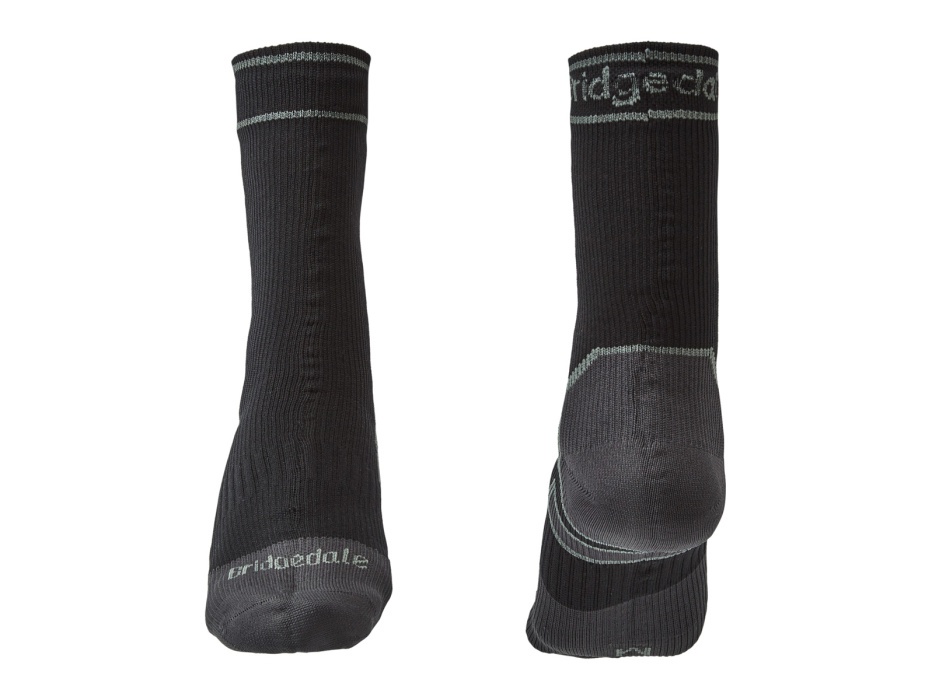 Když jde do tuhého – když se chlad a vlhkost spolčí dohromady – tak to je správná chvíle obout nepromokavé ponožky, které udrží nohy v teple a třeba je i ochrání před omrzlinami. Nepromokavé ponožky Bridgedale v sobě mají membránu Hydrotech s vodním sloupcem 10000 mm a paropropustností 15000 g/m2/24h. Zvenčí chrání membránu před poškozením nylonový úplet a uvnitř udržuje příjemné klima merino vlna, která je odolná vůči zápachu a hřeje i vlhká.
