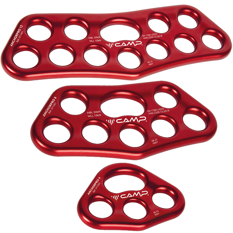 Kotevníí deska pro zbudování přehledného a bezpečného kotevního systému při práci ve výškách, arboristice, záchranných scénářích nebo průmyslovém lanovém přístupu. Konstrukce C.A.M.P. AnchorPRO je navržena s důrazem na vysokou pevnost a dlouhou životnost. Hladké, zaoblené profily umožňují přímé napojení lan i textilních smyček bez nutnosti použití karabin, čímž se snižuje počet spojovacích prvků v systému.
