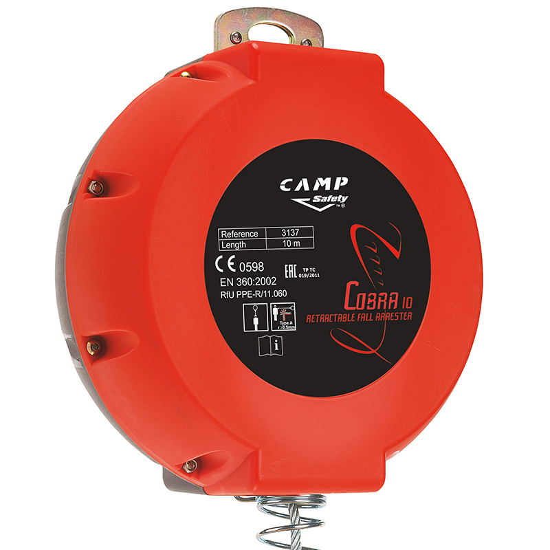 Cobra 10 je samonavíjecí zachycovač pádu s délkou ocelového lana 10m. Systém Cobra 10 je certifikován pro práci na rovné i nakloněné ploše. Galvanizované ocelové lanko s průměrem 4,8mm a maximální pevností 12kN je chráněno velice odolným pouzdrem z velmi odolného ABS platu. Samo navíjecí zachycovač pádu CAMP Cobra 10 nabízí maximální bezpečnost i při zatížení přes ostrou hranu. Součástí systému je ocelová dlaňová auto uzamykatelná karabina s obrtlíkem CAMP Swivel Hook a vnitřní mechanický systém pro tlumení pádu.