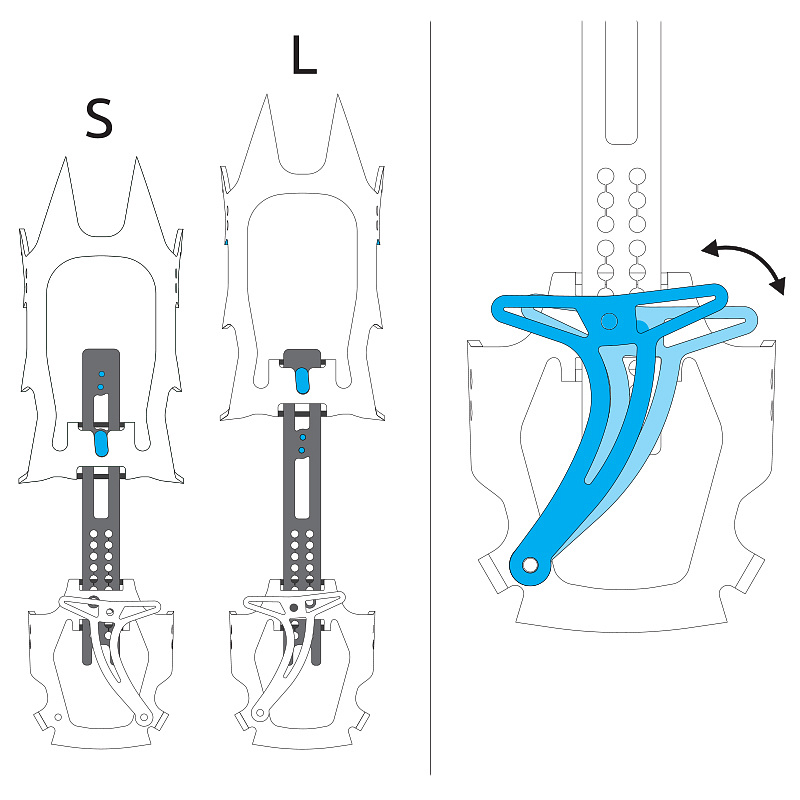 - Spojovací můstek umožňuje mikrometrické nastavení délky a lze ji nastavit do dvou poloh pro malé i velké velikosti bot bez přesahu za patu mačky