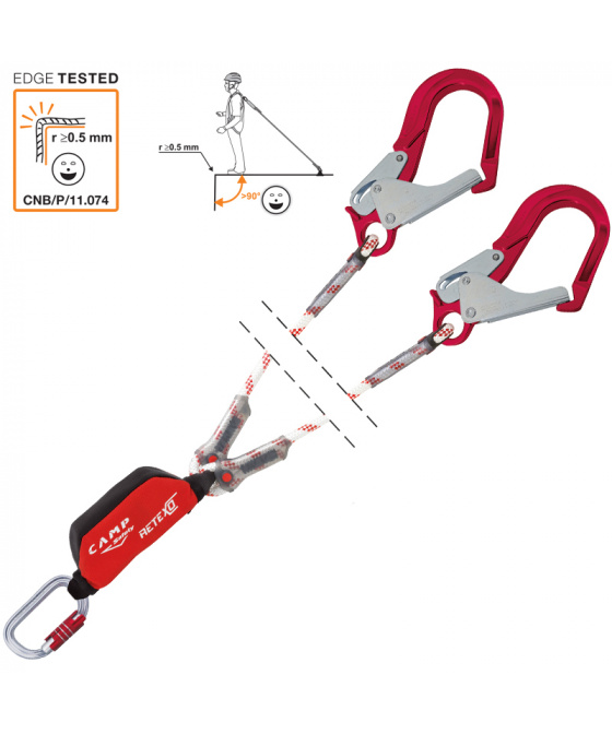 Retexo Rope kombinuje pevnost a odolnost semi-statických lanyardů se skvělými absorbčními vlastnostmi páracího tlumiče pro bezpečné zachycení pádu. Lanyardy jsou vyrobeny ze semi-statického 10,5mm lana CAMP Prium, které vyniká odolností proti otěru a vysokou pevností při zatížení. Šité konce lanyardů jsou opatřeny průhlednými koncovkami pro jednoduchou kontrolu stavu. Systém je opatřen ocelovou oválnou karabinou se šroubovací pojistkou zámku CAMP Oval XL 3Lock, která slouží pro připojení k postroji. Pro zajištění slouží háky z hliníku CAMP Hook Plus se světlostí 62mm. Celková délka absorberu s lanyardy a jistícími háky je 135cm. Certifikováno pro horizontální použití s pádem přes hranu o poloměru r >= 0.5 mm.