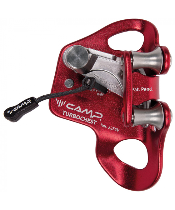 Turbochest je revoluční hrudní blokant vybavený 2 patentovanými otočnými rolničkami pro hladký průchod lana. Rolničky nejen že udržují maximální efektivitu, ale také významně snižují samotné opotřebení výrobku a lana. Ozubená vačka obsahuje odtokové dírky, které zabraňují usazení bláta, písku nebo ledu. Aby zůstal zachován maximální kontakt s lanem pro efektivitu, jsou odtokové otvory také v těle blokantu podél dráhy procházejícího lana. Silnější tělo blokantu a tvarovaný připojovací bod snižují opotřebení mezi zařízením a konektorem, které je způsobováno posunem (zejména při použití s ocelovými karabinami). To také pomáhá udržet blokant ve správné poloze vůči tělu. Obsluha blokantu C.A.M.P. Turbochest je díky poutku u vačky snadná i v rukavicích. Otočné rolničky zároveň umožňují použit Turbochest jako pojistnou kladku pro transport lehkých věcí do 50 kg. V žádném případě však nesmí být tento systém použit pro zajišťování člověka při záchraně.