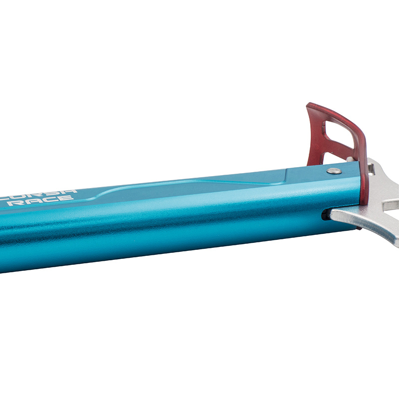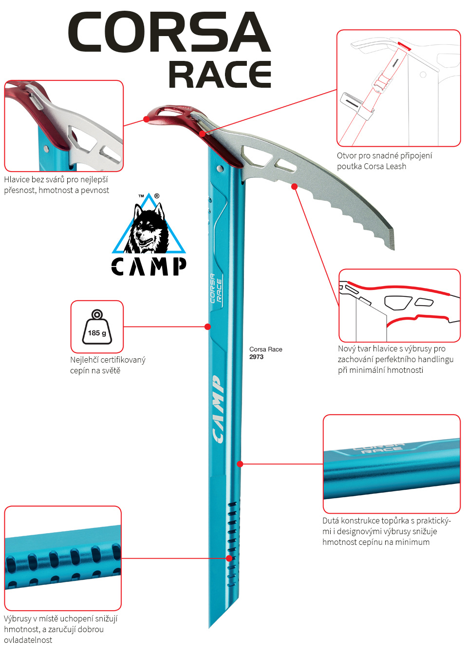 CAMP Corsa RACE je se svými 185 gramy aktuálně nejlehčí certifikovaný cepín na světě. Cepín je speciálně navržený pro závodní skialpinismus, kde je kladen důraz na co nejnižší hmotnosti povinné výbavy. K cepínu Corsa RACE můžete připevnit poutko CAMP Corsa Leash (také novinka 2020) a užít si rychlou turistiku. Vyrábí se pouze v délce 50cm. Vymyšlená koncepce celé hlavice umožňuje nový způsob připojení poutka a díky svému speciálnímu tvaru a výbrusu si Corsa RACE zachovává perfektní handling. Topůrko je zbaveno všech nalepovacích gripů. Proti skluzu působí strojní výbrusy v místech uchopení. Celý cepín je vyroben z hliníku 7075.