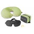 velmi lehká zelená cestovní sada 155g obsahující oční masku deluxe, ucpávky do uší a nafukovací podhlavník, vše uložené v uzavíratelném obalu na doplňkyVíce