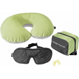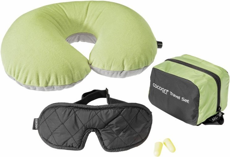 velmi lehká sada obsahující tři cestovní doplňky oční maska Deluxe ve tvaru slunečních brýli pro zmírnění tlaku na oči ucpávky do uší ultralehký nafukovací podhlavník z příjemného mikrovlákna zipem uzavíratelný obal pro uložení dalších cestovních doplňků