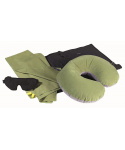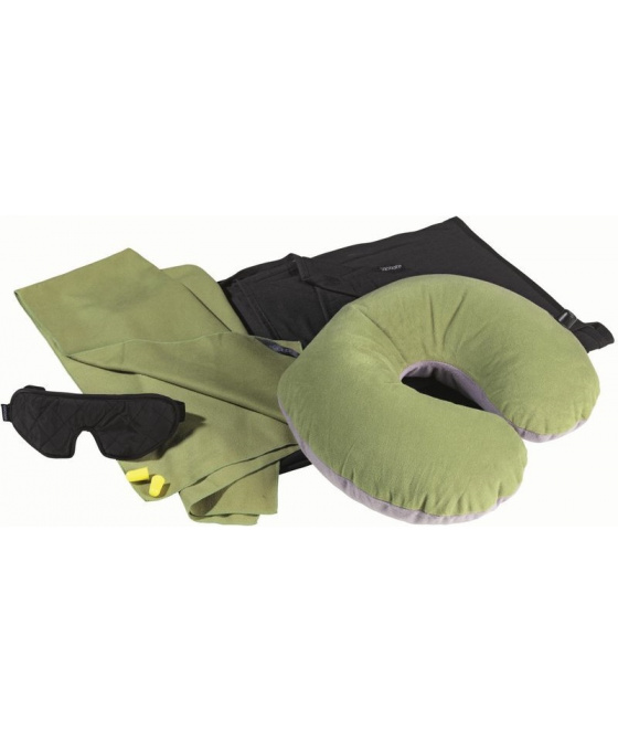 velmi lehká sada obsahující šest cestovních doplňků prodyšná cestovní přikrývka ze čtyřkomorového polyesterového mikrovlákna CoolMax® s vysokou schopností odvádět vlhkost, zachovávat teplotní stabilitu a udržovat tělo v suchu a ohodlí oční maska Deluxe ve tvaru slunečních brýli pro zmírnění tlaku na oči ucpávky do uší ultralehký nafukovací podhlavník z příjemného mikrovlákna ručník z mikrovlákna 90 x 50 cm zipem uzavíratelný obal pro uložení dalších cestovních doplňků
