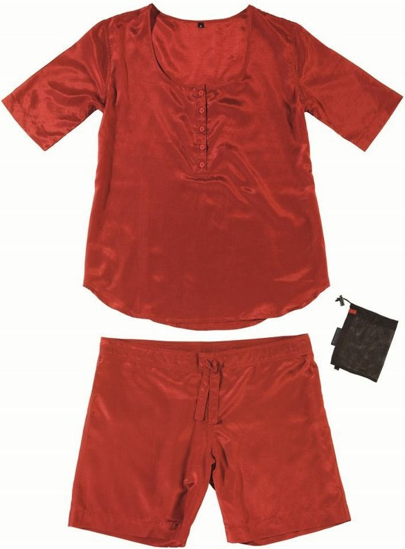 extrémně lehký funkční dámský noční úbor pro aktivní cestovatelky zapínání u krku krátké kalhoty se stahovací šňůrkou hedvábná bavlna je vynikající materiálkombinující vlastnosti egyptské bavlny a hedvábí v poměru 55% hedvábí a 45% egyptské bavlny hedvábná bavlna je trvanlivější, o něco těžší a silnější než čistéhedvábí dobře reaguje na měnící se teploty, působí měkce na pokožku velmi malá velikost balení