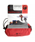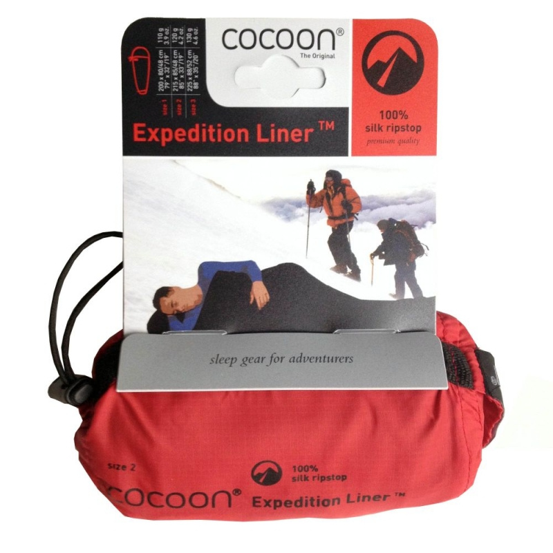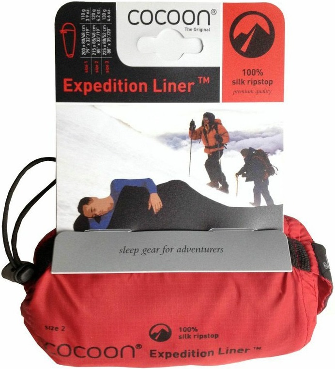 speciální expediční vložka do spacího pytle s vynikajícími vlastnostmi v malém a lehkém balení lehké hedvábí ripstop v černé barvě je inovativní materiál vyvinutý COCOON, který je pevnější a odolnější proti roztržení než běžné hedvábí materiál velmi rychle schne rozdílné velikosti jsou uzpůsobeny k minimalizaci rozměrů a hmotnosti elastická stahovací kapuce, díky které lze mít odkrytou pouze špičku nosu kompresní vak je vyroben z voděodolného silikonizovaného nylonu ripstop a je napevno připevněn k expediční vložce vak může sloužit např. pro uložení baterky nebo jiných osobních věcí poutka na kapuci a v prostoru nohou pro možnost zavěšení (např. při sušení) teplota určuje přidanou hodnotu k teplotnímu komfortu spacího pytle, teplota se může lišit o 2°C v obou směrech testováno laboratoří REILAB (Reservoirs Environmental, Inc.) v Coloradu, poskytující analytické služby v oblasti průmyslové hygieny, životního prostředí a potravinářského průmyslu