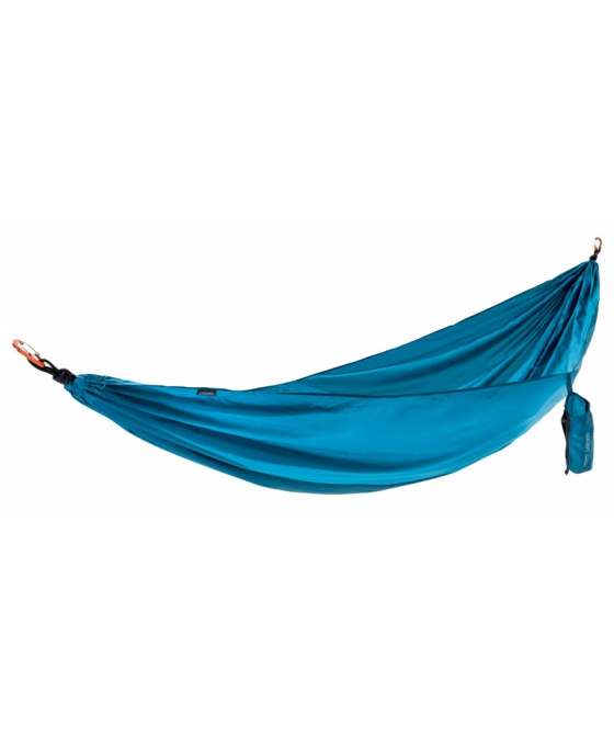 tyrkysová cestovní hamaka pro jednoho s nosností 180kg z pevného ripstop nylonu, zesíleným prošíváním, úložným kompresním vakem sloužícím jako kapsa na drobnosti a dvěma hliníkovými karabinami 12KNVíce