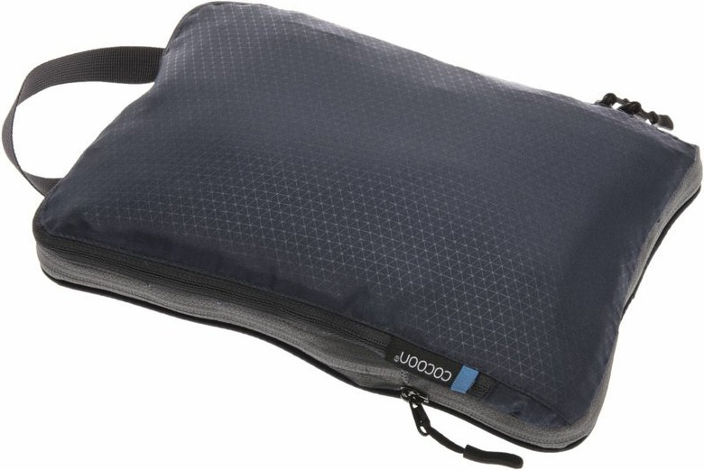 odolný kompresní obal poskytující úsporu místa v zavazadle s kompresními YKK zipy obal umožňuje změnit objem z 1.2 litru na 3.9 litru rozepnutím obvodového zipu vyrobeno z odolného pevného polyesteru s reliéfním vzorem poutko pro uchopení