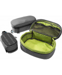polstrovaný organizér pro ukládání cenných předmětů, jako jsou fotoaparáty, elektronická zařízení nebo léky silně polstrované stěny jsou vyplněné pěnou s vysokou hustotou a chrání uložené doplňky před nárazem a poškozením uzavírání pomocí YKK zipu vyrobeno z TPU laminovaný polyesteru v kombinaci s nylonovou tkaninou vrstva netkané textilie potažené slabou aluminiovou vrstvou udržuje uvnitř pouzdra chlad a zabraňuje pronikání tepla kapsa ze síťoviny na zip na vnitřní straně víka pro uložení drobností poutka na spodní straně umožňují připnou organizér k opasku nebo popruhu batohu či zavazadla poutko pro přenášení organizér lze použít také jako prostornou toaletní tašku
