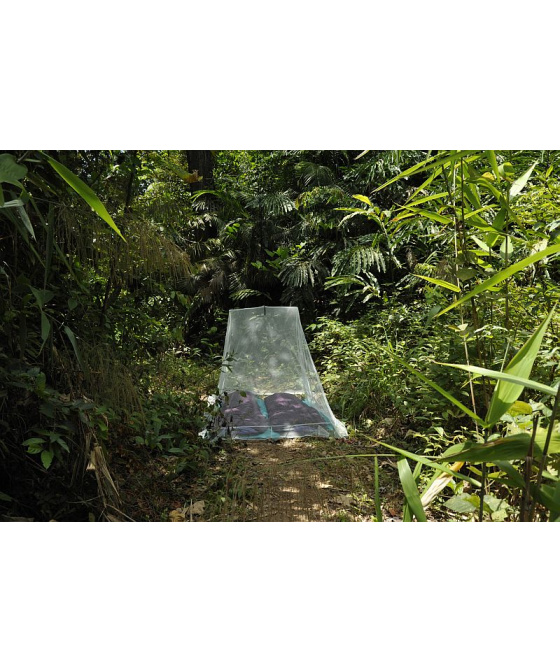 -velmi jemná a ultralehká outdoorová moskytiéra pro dvě osoby -vyrobeno z jemné nylonové síťoviny -hustota 100 otvorů na 1 cm2 -barevně označené tkaničky na bocích a na vrcholu sítě -kapsy na kameny pro zatížení v každém rohu moskytiéry -lehké sklolaminátové tyčky pro zpevnění horního okraje moskytiéry -součástí je šňůrka pro pověšení moskytiéry a zavrtávací skobička -maximální výška 130 cm -kompresní vak se stahovací šňůrkou, bočním zipem a poutkem pro zavěšení