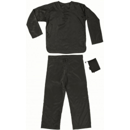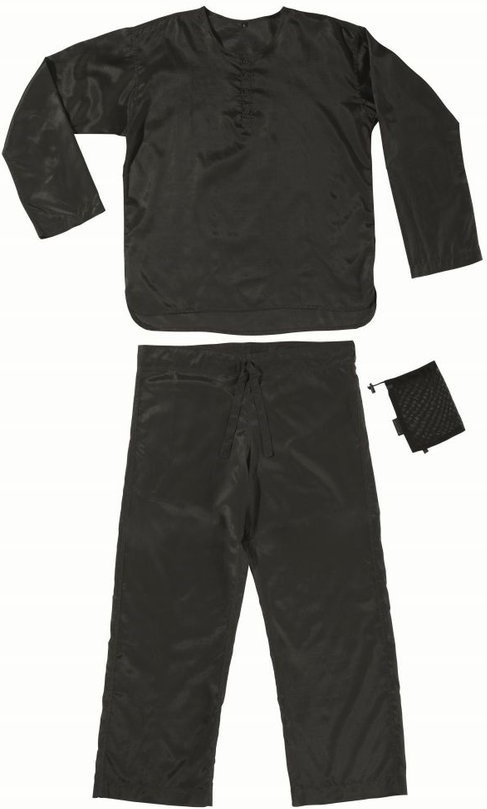 černý extrémně lehký funkční pánský noční úbor XXL z hedvábné bavlny dobře reagující na měnící se teploty, se zapínáním u krku a kalhotami se stahovací šňůrkou určený pro aktivní cestovateleVíce