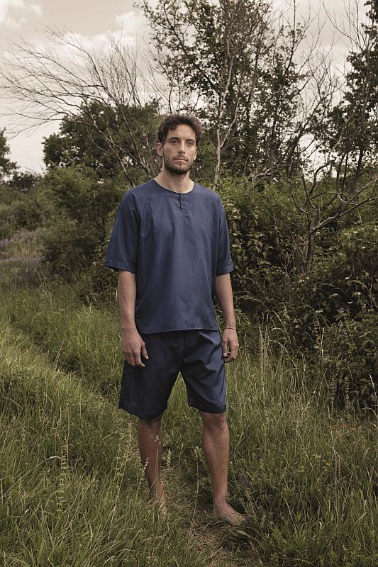 tmavomodrý extrémně lehký funkční pánský noční úbor XL z hedvábné bavlny dobře reagující na měnící se teploty, zapínáním u krku a krátkými kalhotami se stahováním určený pro aktivní cestovateleVíce