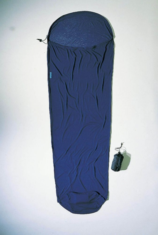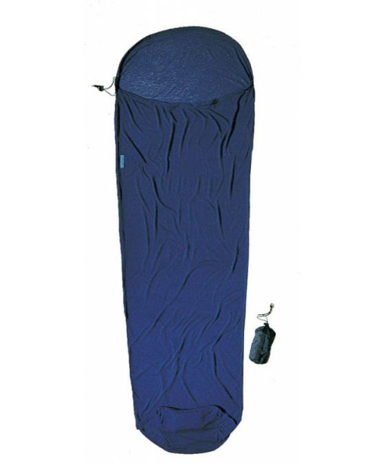 modrá přikrývka 255g z coolmaxu tvaru mumie vhodná jako cestovní spací pytel do teplých krajin nebo hygienická pokrývka a přidávající 4,7°C k teplotnímu komfortu spacího pytleVíce
