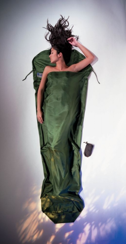 olivová přikrývka 135g z hedvábí tvaru mumie vhodná jako cestovní spací pytel do teplých krajin nebo hygienická pokrývka a přidávající 5,3°C k teplotnímu komfortu spacího pytleVíce