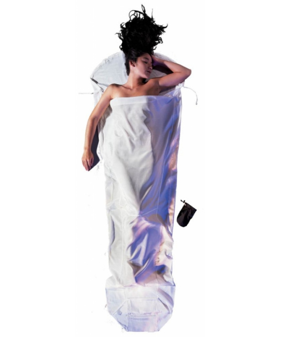 bílá přikrývka 180g z hedvábné bavlny tvaru mumie vhodná jako cestovní spací pytel do teplých krajin nebo hygienická pokrývka a přidávající 4,8°C k teplotnímu komfortu spacího pytleVíce
